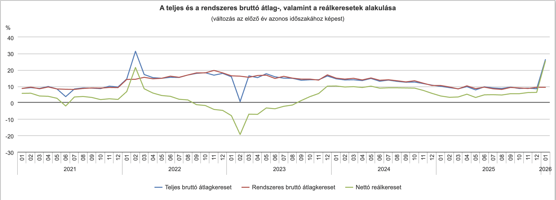 A januári adatok egyik érdekes eleme, hogy a nettó átlagkereset gyorsabban nőtt, mint a bruttó. Miközben a bruttó átlagkereset 26,3 százalékkal emelkedett, a nettó átlagkereset 28,0 százalékos növekedést mutatott. Ennek hátterében a KSH szerint több adózási és családtámogatási változás áll.