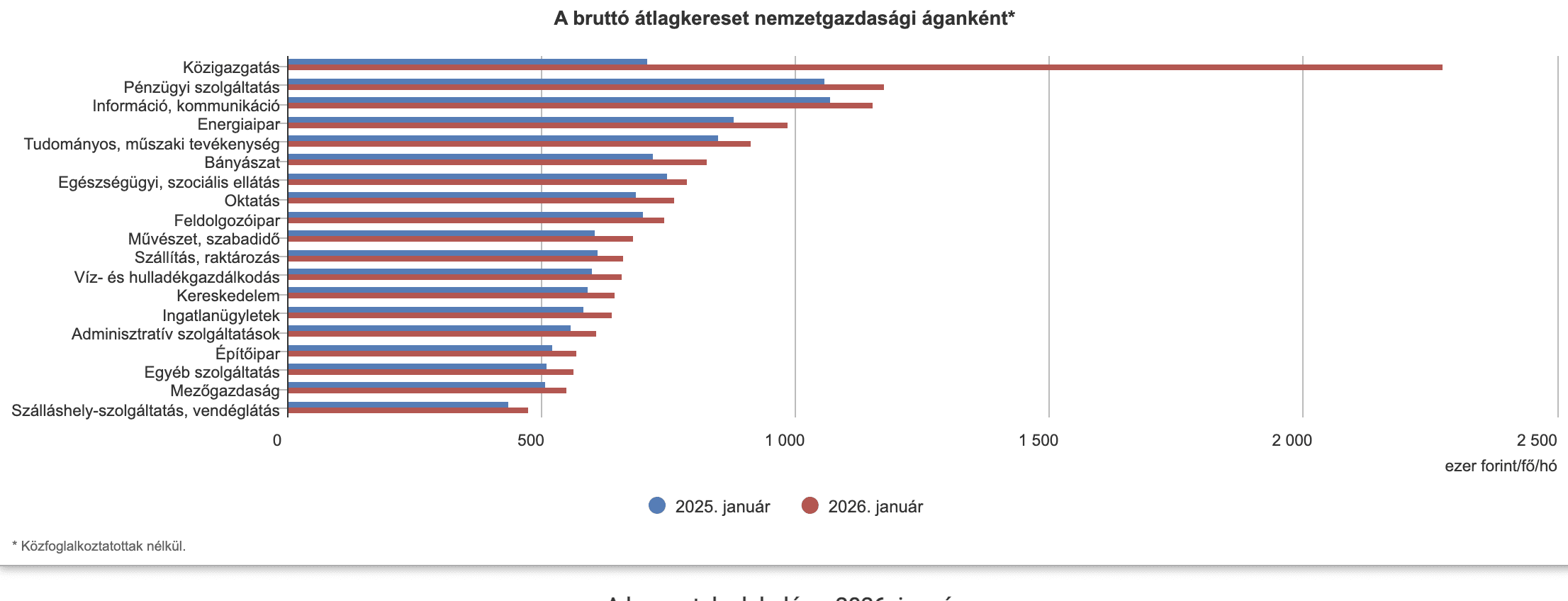 Ez azért fontos, mert a 26,3 százalékos bruttó növekedés azt sugallhatja, hogy a bérek széles körben, tartósan és egységesen ugrottak meg ekkora mértékben. A statisztikai átlagot jelentősen felfelé húzta egy olyan egyszeri állami juttatás, amely nem általános a teljes foglalkoztatotti körben, és nem tekinthető a rendszeres bérdinamika részének. A költségvetési szektorban, különösen a közigazgatás és védelem nemzetgazdasági ágban volt ennek erős hatása. Vagyis a januári összképben az állami intézkedés miatt ugrott nagyot a teljes átlagkereset.