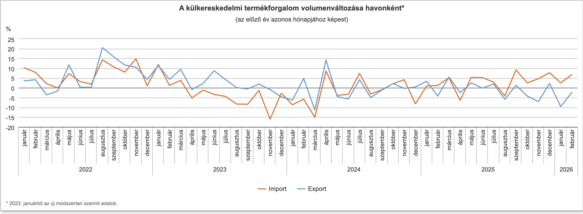 A szezonálisan és munkanappal kiigazított adatok szerint februárban a kivitel volumene 2,6 százalékkal, a behozatalé pedig 1,2 százalékkal meghaladta a januári szintet. Ez arra utal, hogy havi összevetésben mindkét oldalon élénkülés történt, éves alapon azonban továbbra is kedvezőtlenebb kép rajzolódott ki, különösen az import dinamikus növekedése miatt.